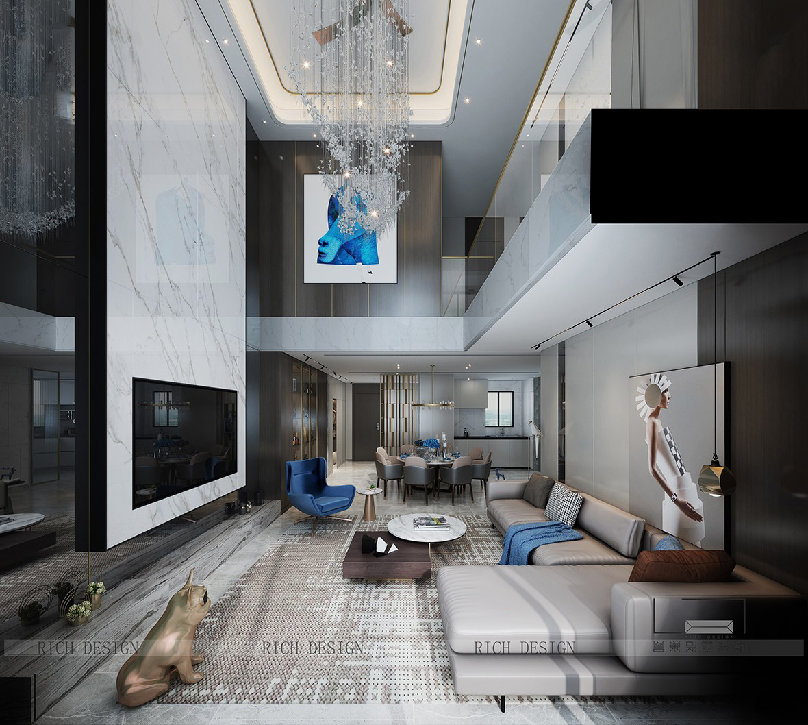革新 生活從空間規劃到材質語言,逐步形成生活場景的界面,設計師從地理位置及文化記憶出發,從自然中提取配色和材質的靈感,以超越傳統樣板間的形態,精致打造一處時代革新的高品質高配套的棲居之所。金迪世紀駐深圳南山區華僑城版塊,以其得天獨厚的地段價值,背山面海,擁享“一城一灣,兩園三山”的豐富生態資源。出則都市繁華、入則小隱于市。▲客 廳一樓客廳為兩層挑空空間,尺度上的把控給予空間更多的舒適性,入戶映眼所及...